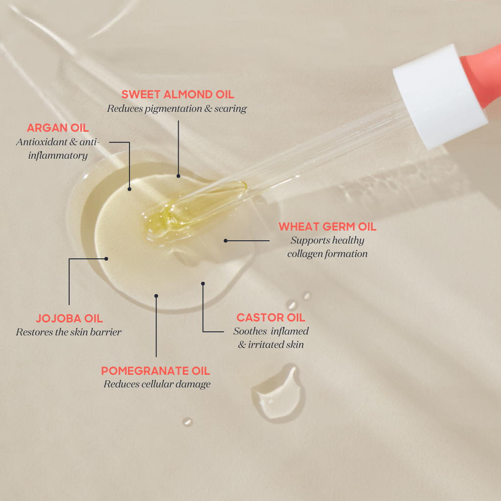 A deeply nourishing oil that strengthens the skin from the inside out to relieve itching and diminish the appearance of scars and stretch marks.