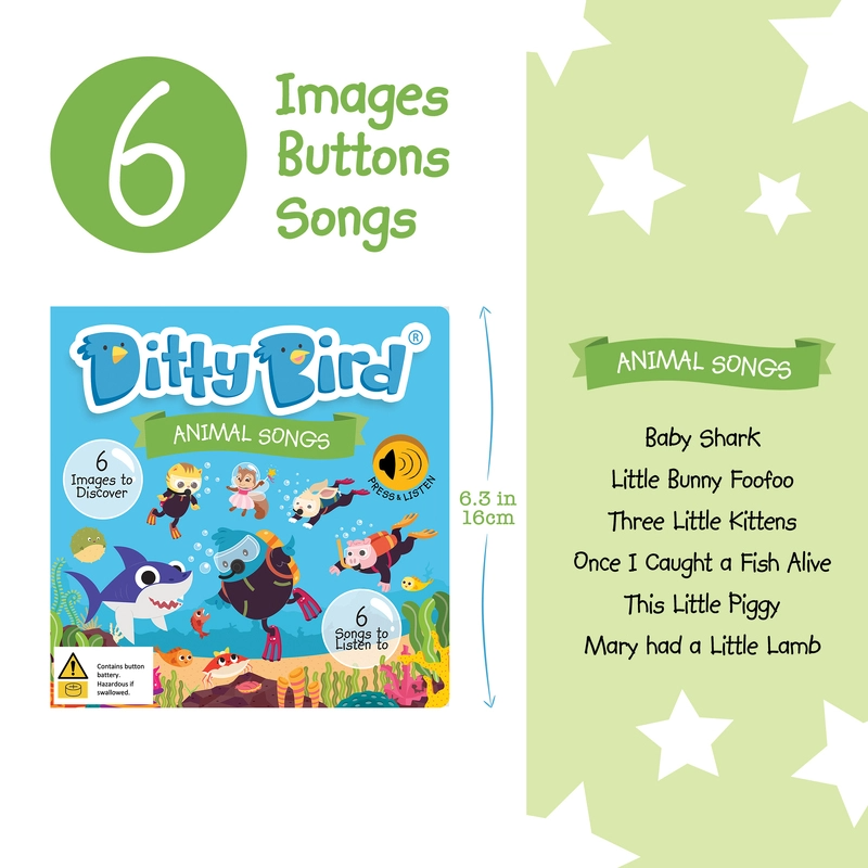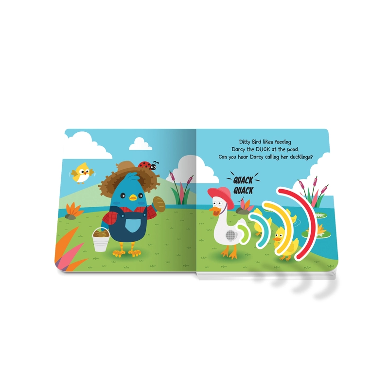 Join Ditty Bird as he explores the farm and learns about all the different sounds the animals make. What sound does Robby the Pig make? Touch the sound button to hear the real-life sounds of each animal. Touch the button to turn the sound off. Also includes a fun farm animal song.