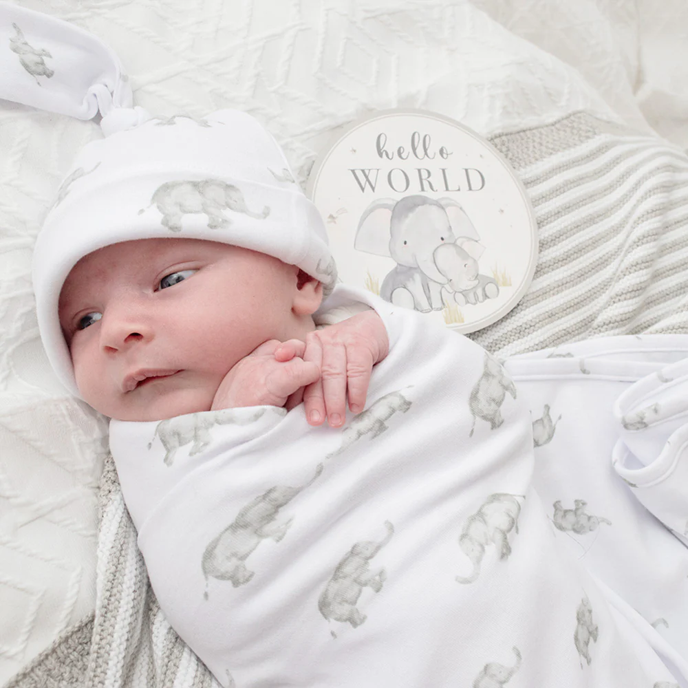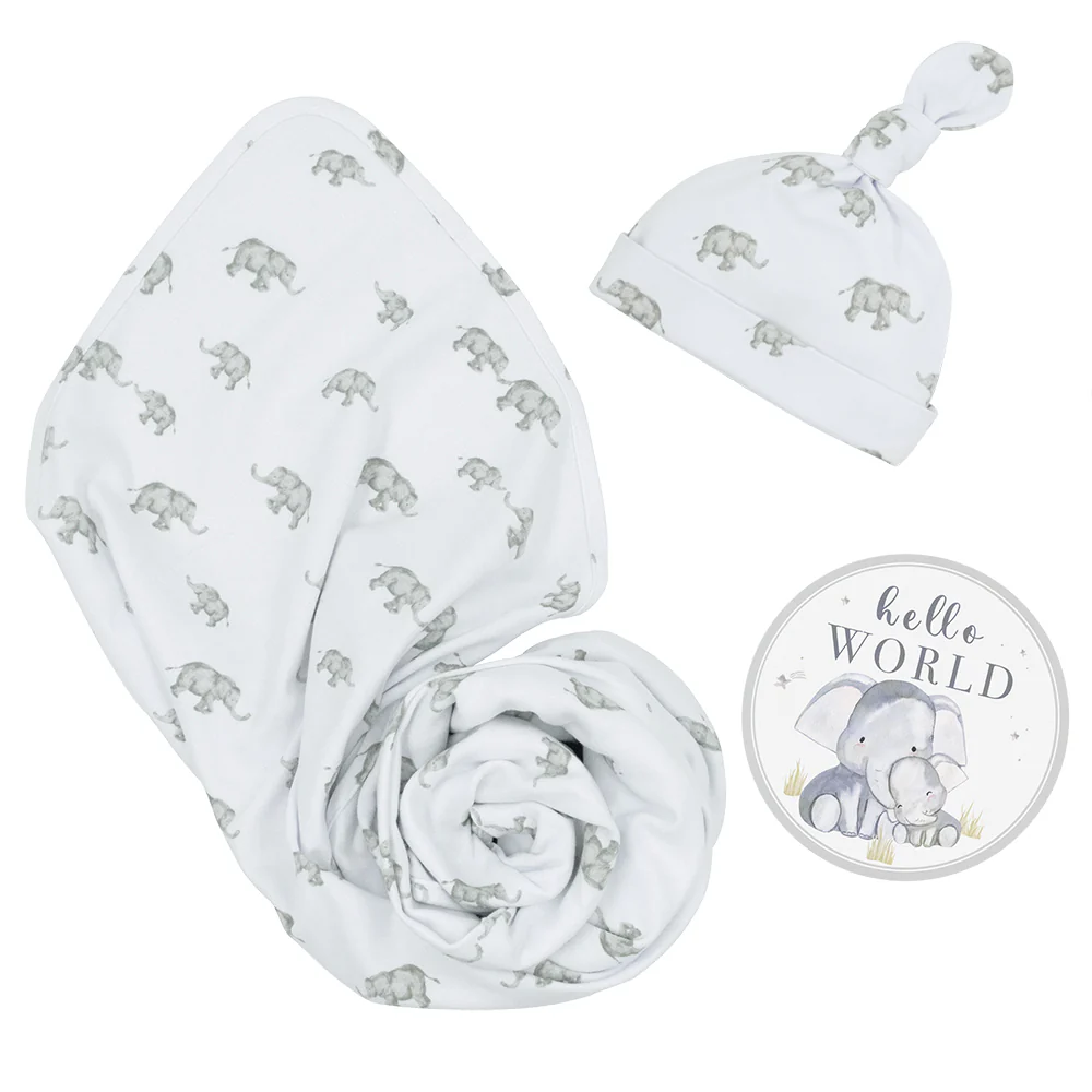 Introduce your little one to the world with this sweet newborn gift set. Featuring a 100% cotton jersey swaddle wrap, matching beanie and a double-sided birth announcement card, you can welcome your baby in style.