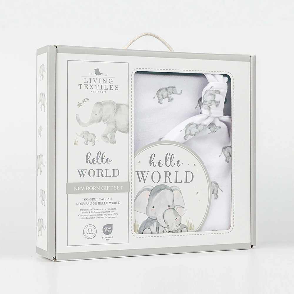 Living Textiles Hello World 3 Pieace Gift Set - Watercolour Grey Elephant