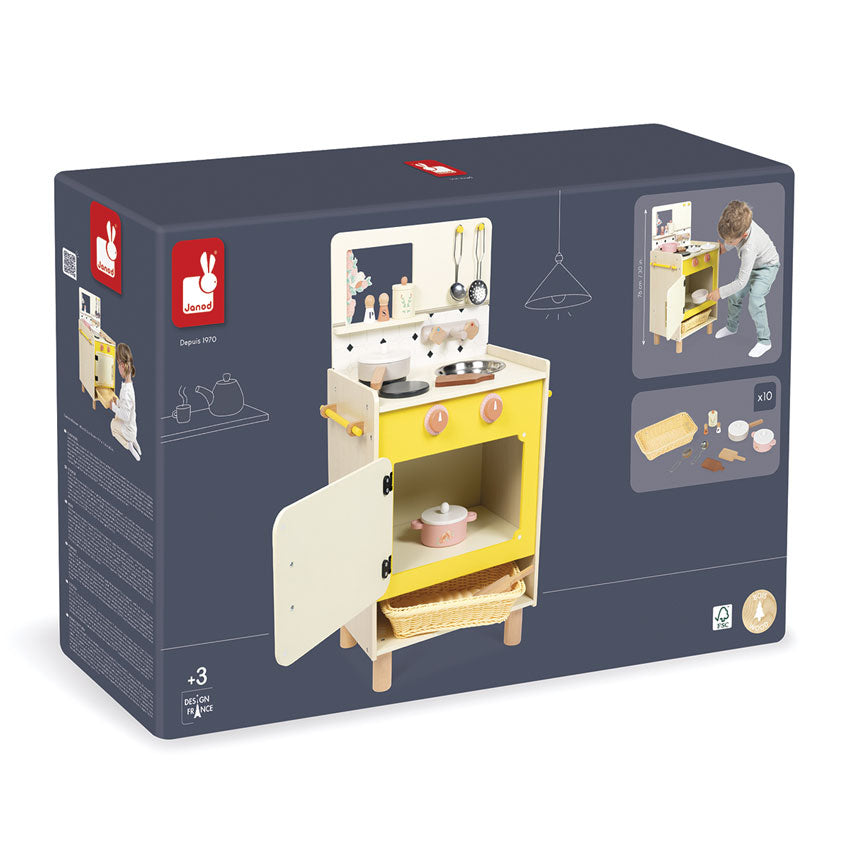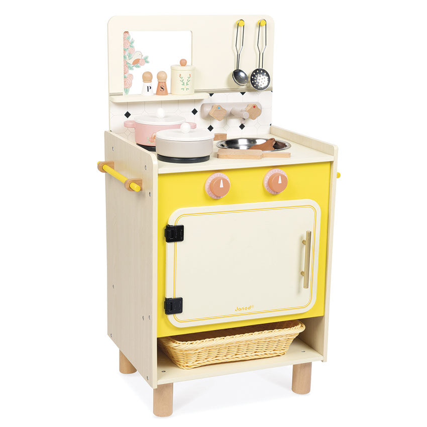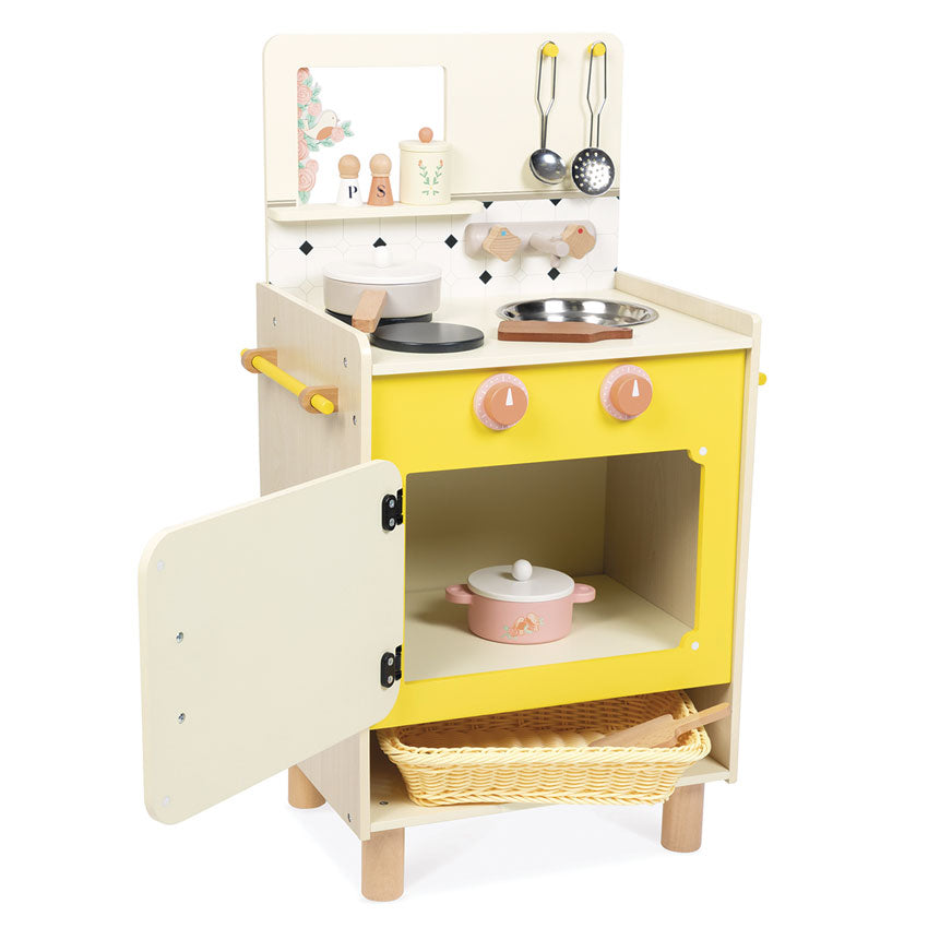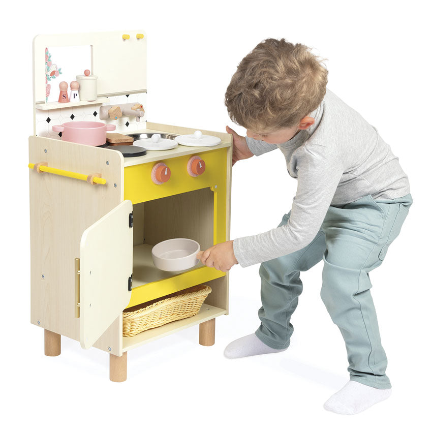 This kitchen is made from eco-friendly FSC certified wood, and comes with 10 play essentials, including 2 cutting boards, a frying pan, saucepan, skimmer, ladle, salt and pepper shakers, a spice jar and a large basket. Watch as your child prepares ingredients, simmers imaginary stews, and seasons their dishes to perfection, all while inventing captivating stories.