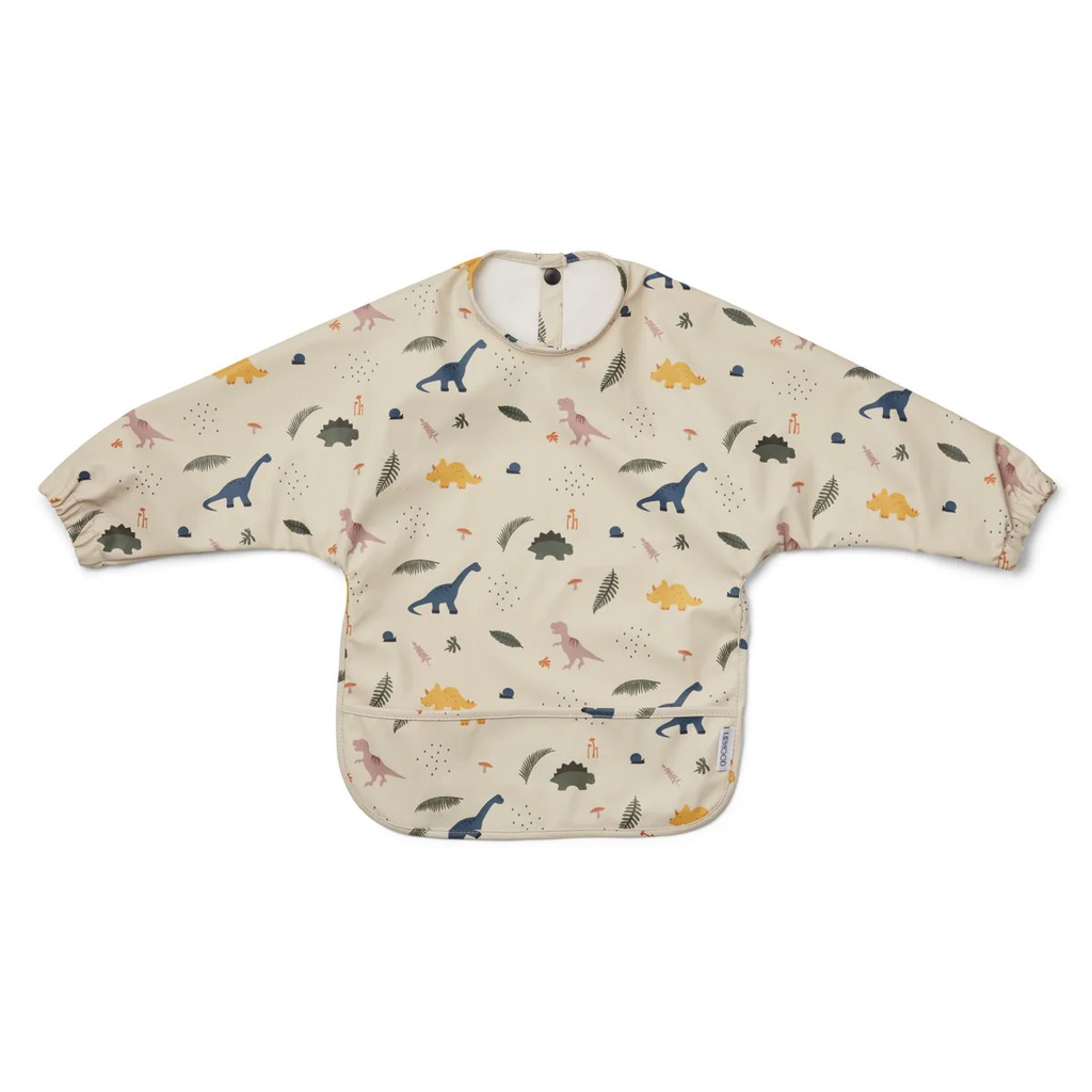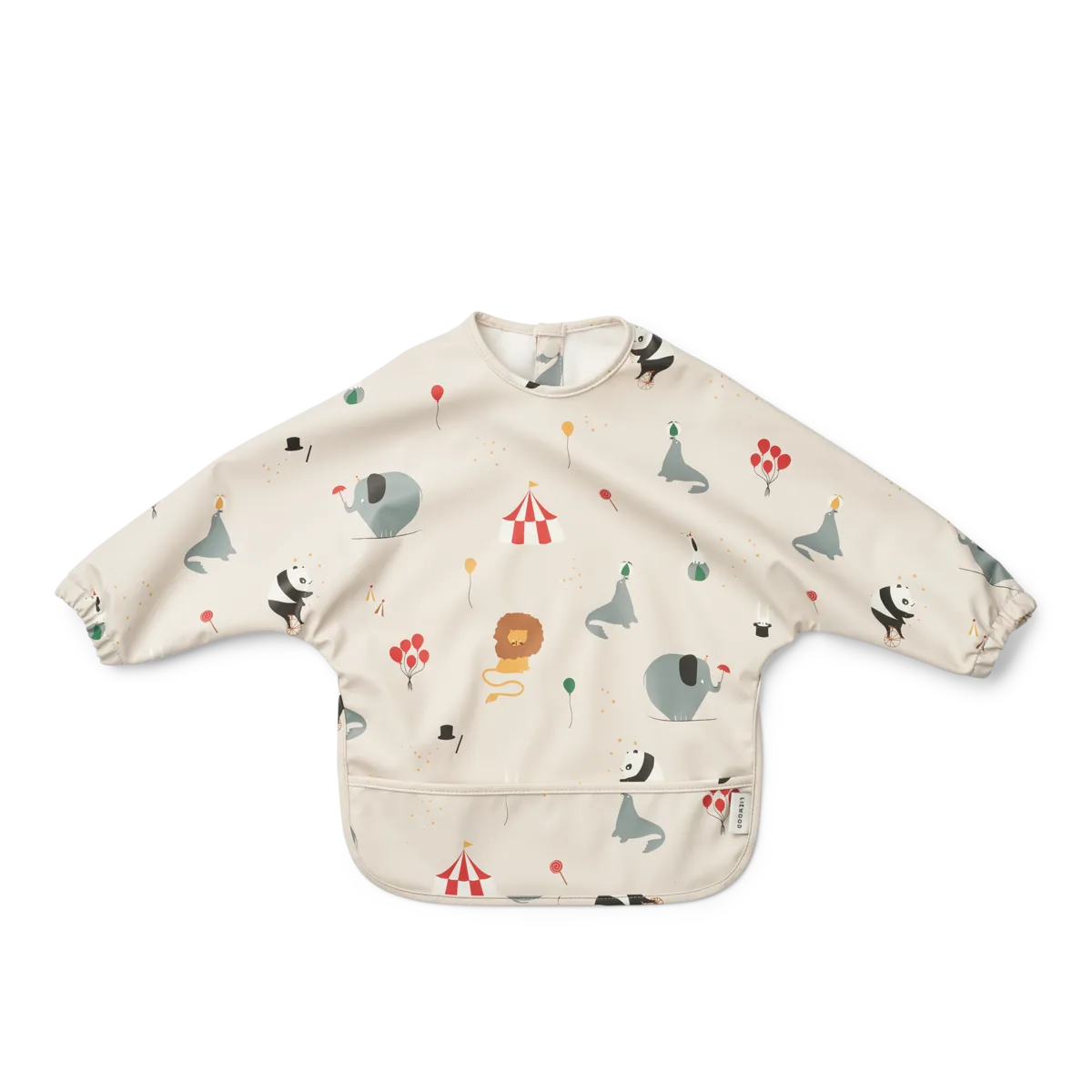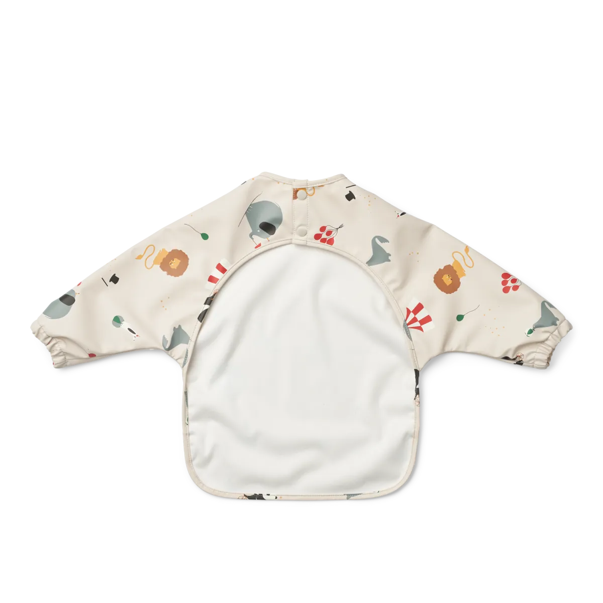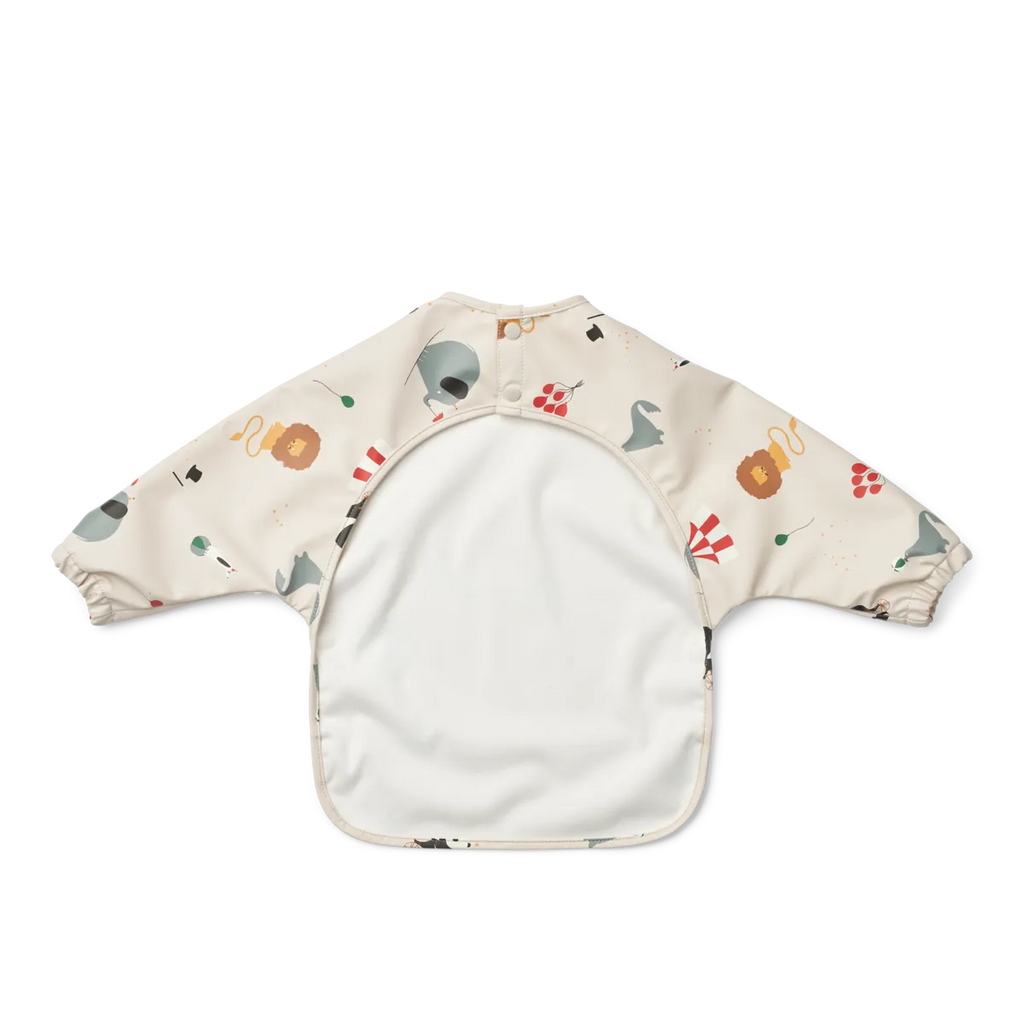 Lightweight cape bib for children who are learning to eat. The recycled material makes it instantly re-usable: simply rinse and wipe clean.