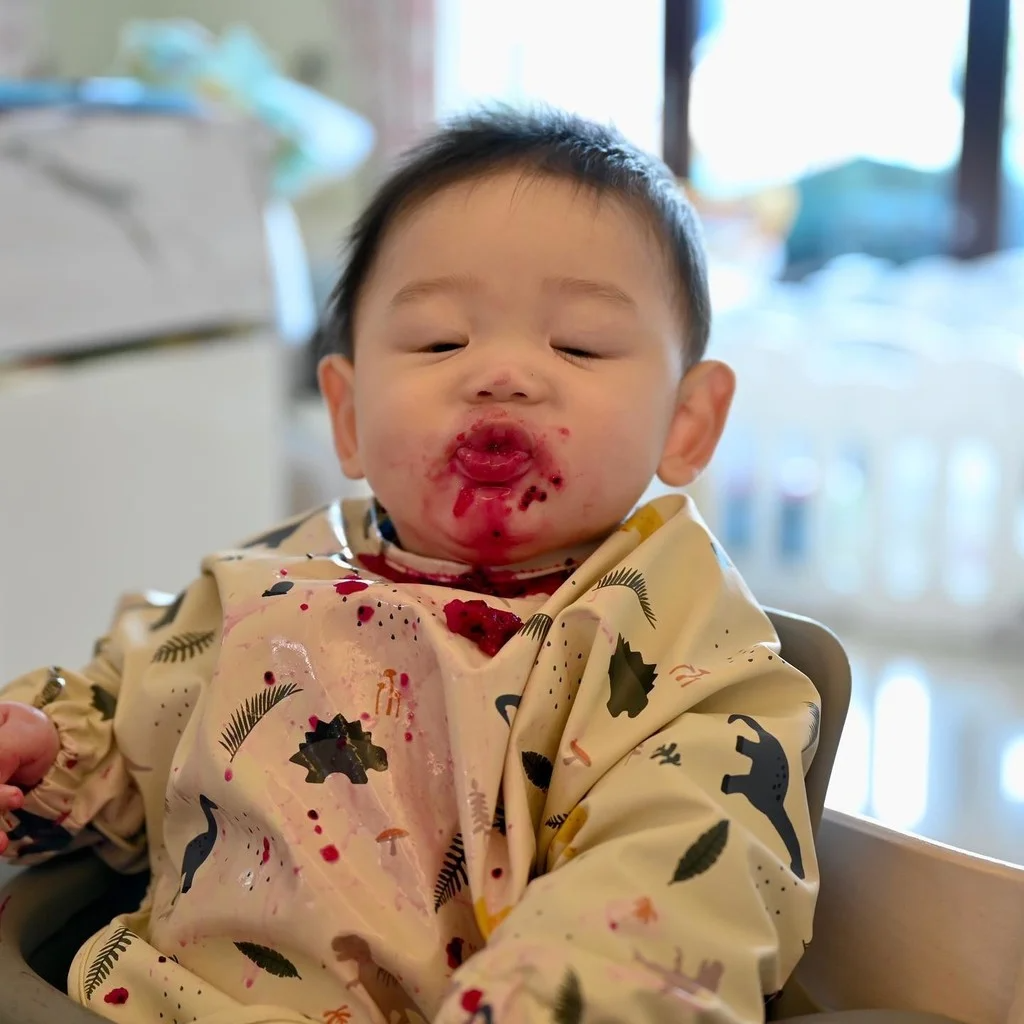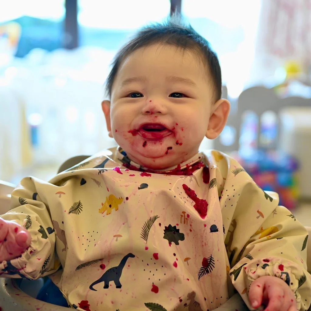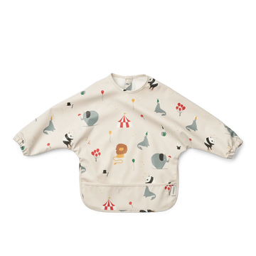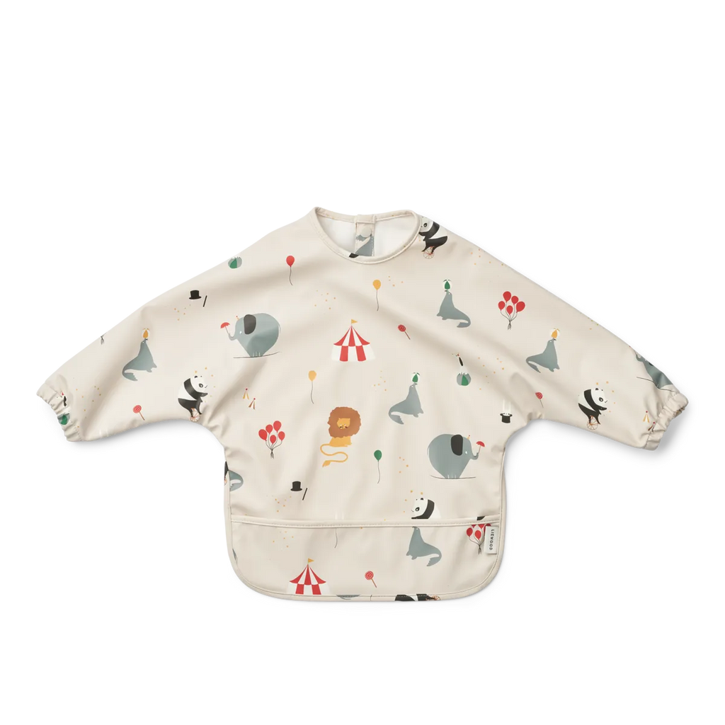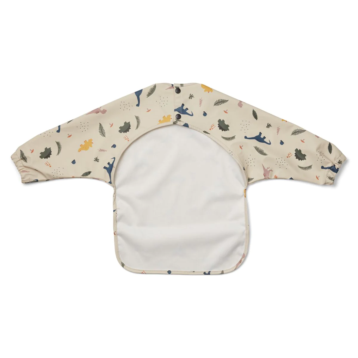 Lightweight cape bib for children who are learning to eat. The recycled material makes it instantly re-usable: simply rinse and wipe clean.