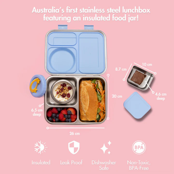 Designed for hearty eaters and busy school days, the Hot N Cold Hero Box 2.0 is Australia's first stainless steel lunchbox with an integrated (removable) insulated food jar - so you can send hot noodles, warm soups, or chilled yoghurt and a fresh lunch, all in one box.